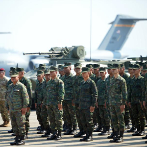 2月28日,多國軍人在泰國羅勇府烏塔堡海軍基地出席開幕式。