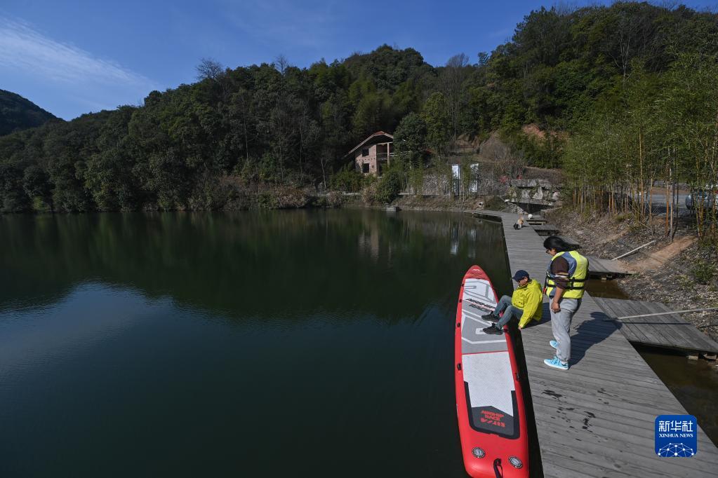 2月28日,在杭州市臨安區玲瓏街道前山村51Camp營地,負責人丹裕(左)在教一名游客如何使用槳板。