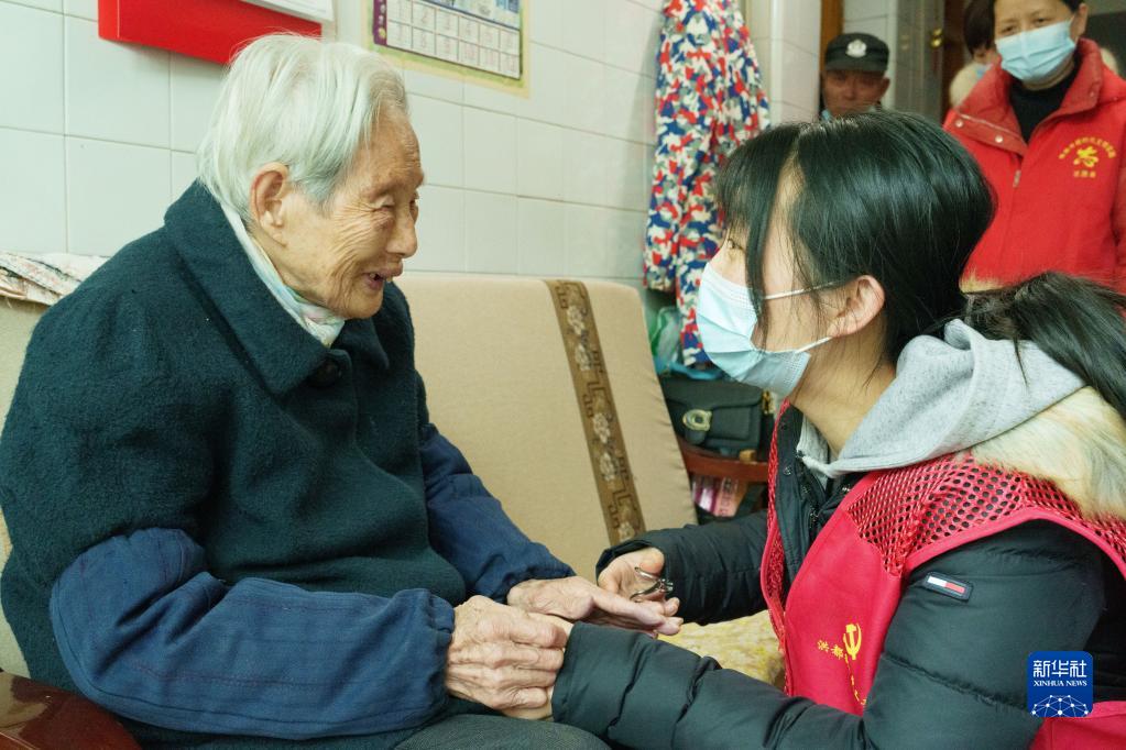 2月28日,在江西省南昌市青云譜區洪都街道洪西社區,社區工作人員戴琳(右)為88歲的湯秀英老人修剪指甲。