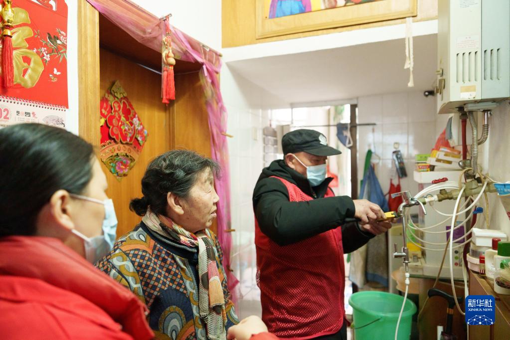 2月28日,在江西省南昌市青云譜區洪都街道洪西社區,社區工作人員在85歲的余文秀老人家中檢修水管。
