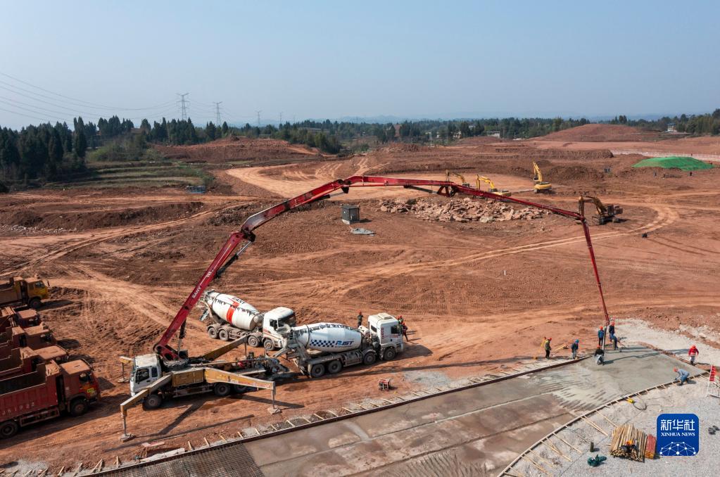 2月26日,在重慶銅梁區少云鎮高碑村川渝1000千伏特高壓交流工程(重慶段)特高壓變電站施工現場,工人們依靠大型機械設備進行施工作業(無人機照片)。