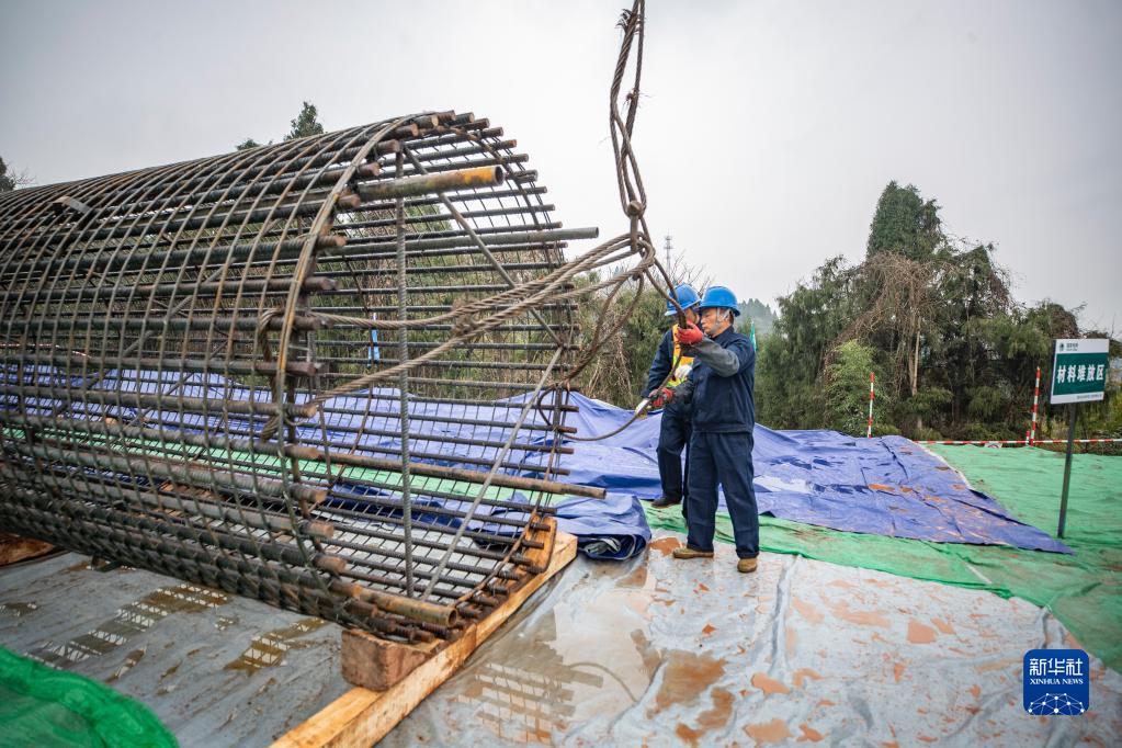3月1日,在重慶市潼南區小渡鎮川渝1000千伏特高壓交流工程(重慶段)施工現場,工作人員在捆綁即將起吊的鋼筋籠。