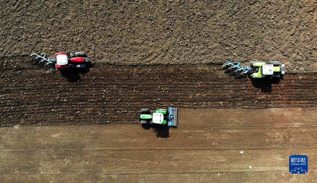 在萊西市夏格莊鎮曲家泊南村農田里,安裝了北斗精準定位輔助系統的拖拉機在進行翻整協同(翻地、整地同時進行)作業(2月28日,無人機照片)。