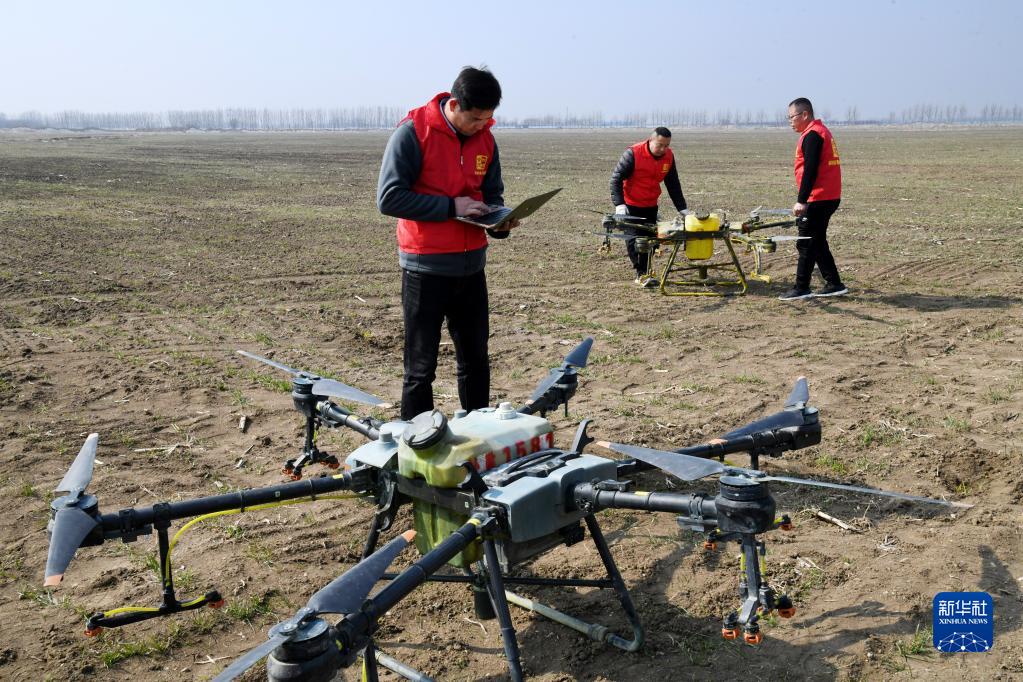 在萊西市夏格莊鎮數字農業產業園內,技術人員將最新航測數據導入植保無人機,為精確噴灑作業提供數據支持(2月28日攝)。