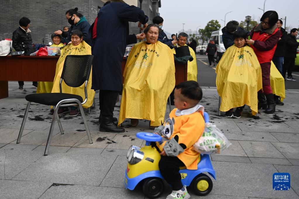 3月1日,志愿者在寧波市奉化區錦屏街道錦軒社區免費為居民理發。