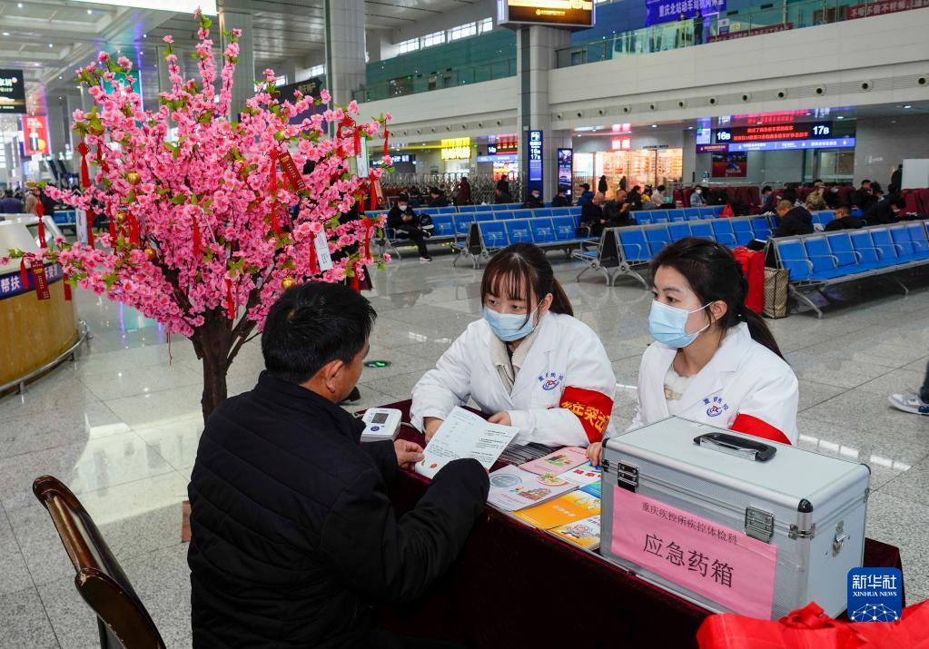 3月1日,在重慶北站北廣場(重慶火車站下轄車站)候車室內,“學雷鋒志愿服務隊”成員在為旅客提供義診服務。
