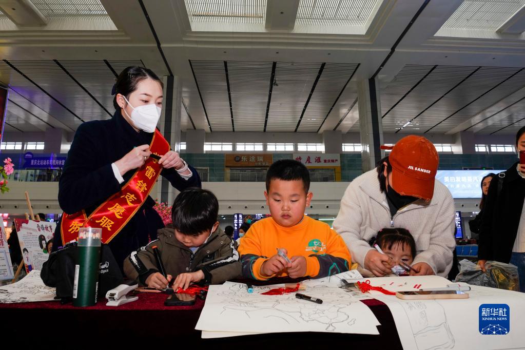 3月1日,在重慶北站北廣場(重慶火車站下轄車站)候車室內,“學雷鋒志愿服務隊”成員在指導參加彩繪活動的小朋友們為雷鋒同志卡通像上色。