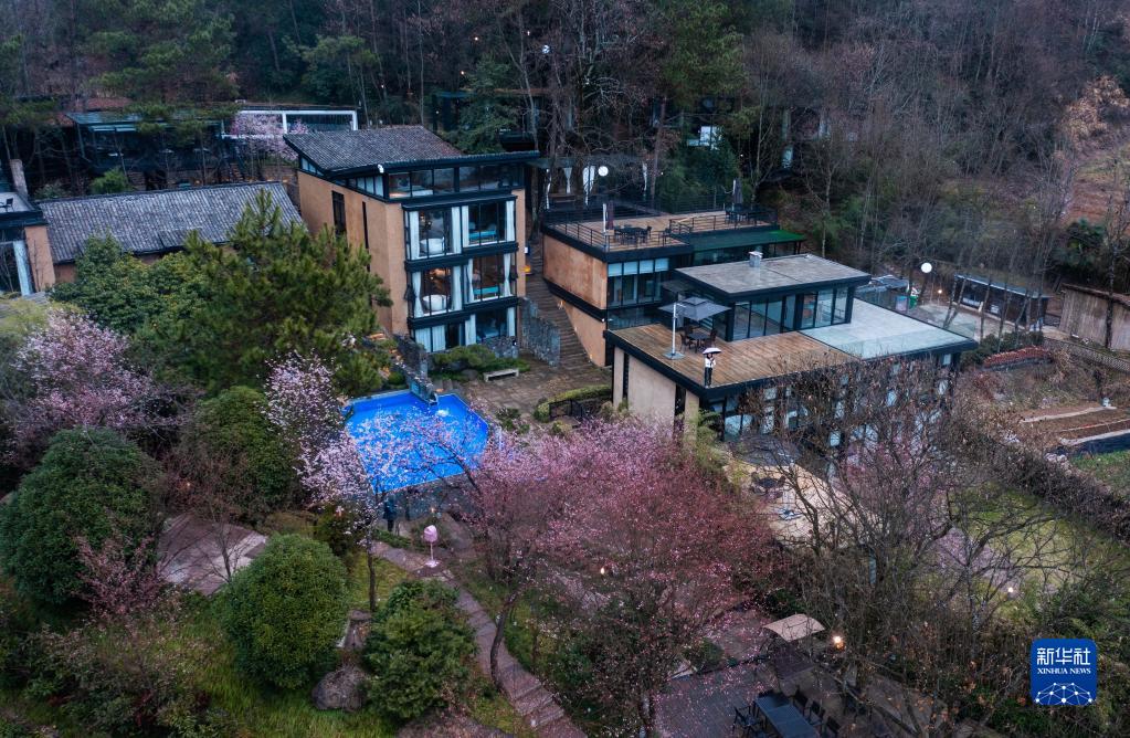 2月28日拍攝的三都鎮前源村山頂一家被櫻花樹包圍的民宿(無人機照片)。