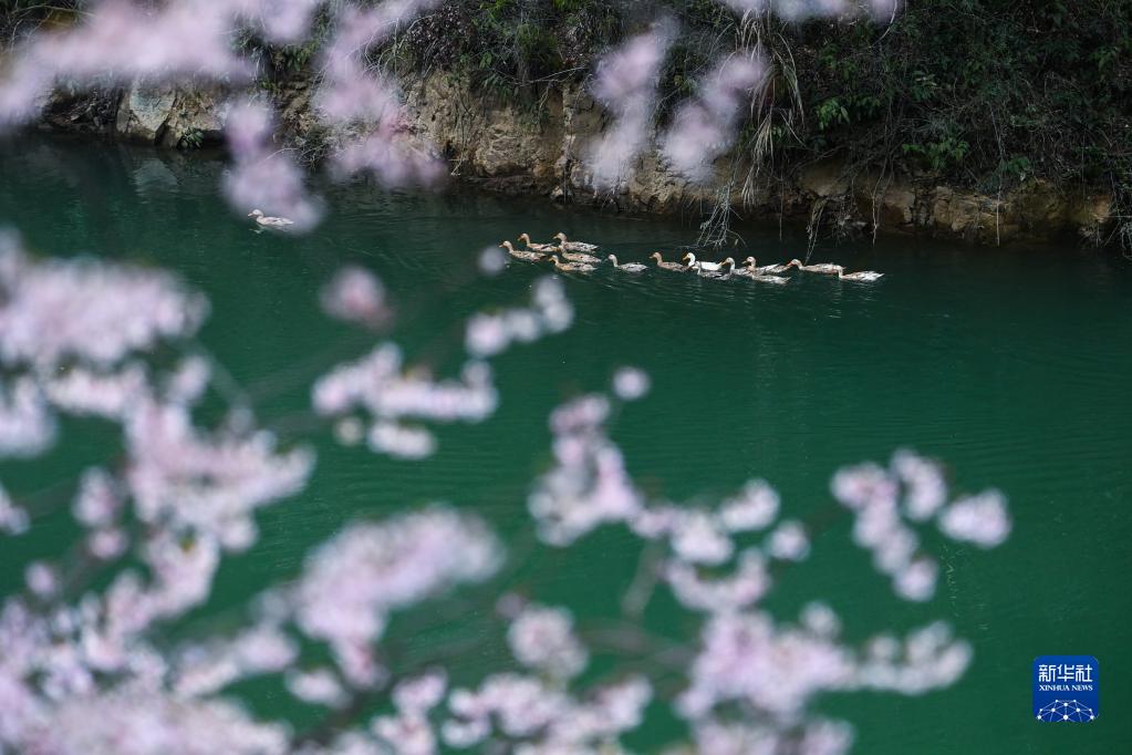 三都鎮大唐村池塘里的鴨子與盛開的野櫻花相映成景(3月1日攝)。