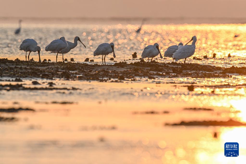 一群黑臉琵鷺在環新英灣地區一處濕地休憩(2022年12月13日攝)。