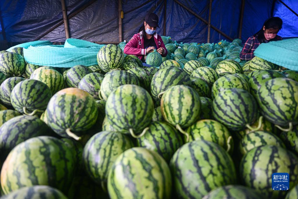 農戶在海南省儋州市中和鎮打包采收的麒麟西瓜(2月24日攝)。
