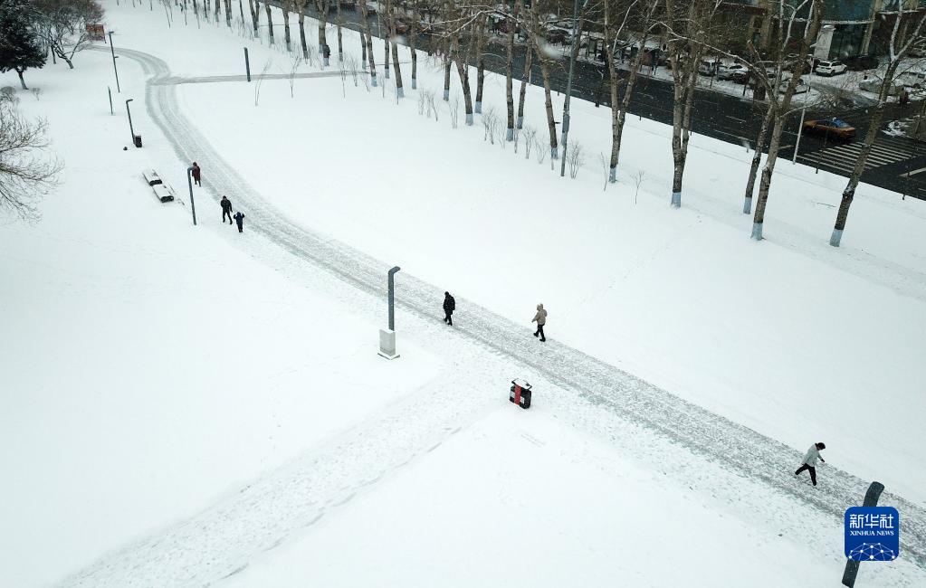 3月1日,在哈爾濱市湘江公園,市民在雪中散步(無人機照片)。
