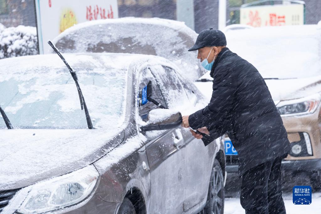 3月1日,在哈爾濱市香坊區,市民清掃車輛上的積雪。