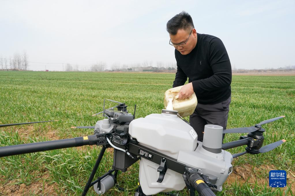 2月28日,王昌在來安縣水口鎮擁巷村為植保無人機添加除草劑。