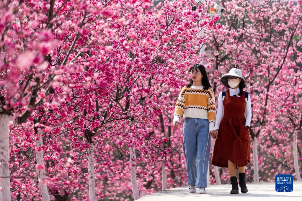 3月1日,兩名游客在宜良縣山后櫻花谷觀光游覽。