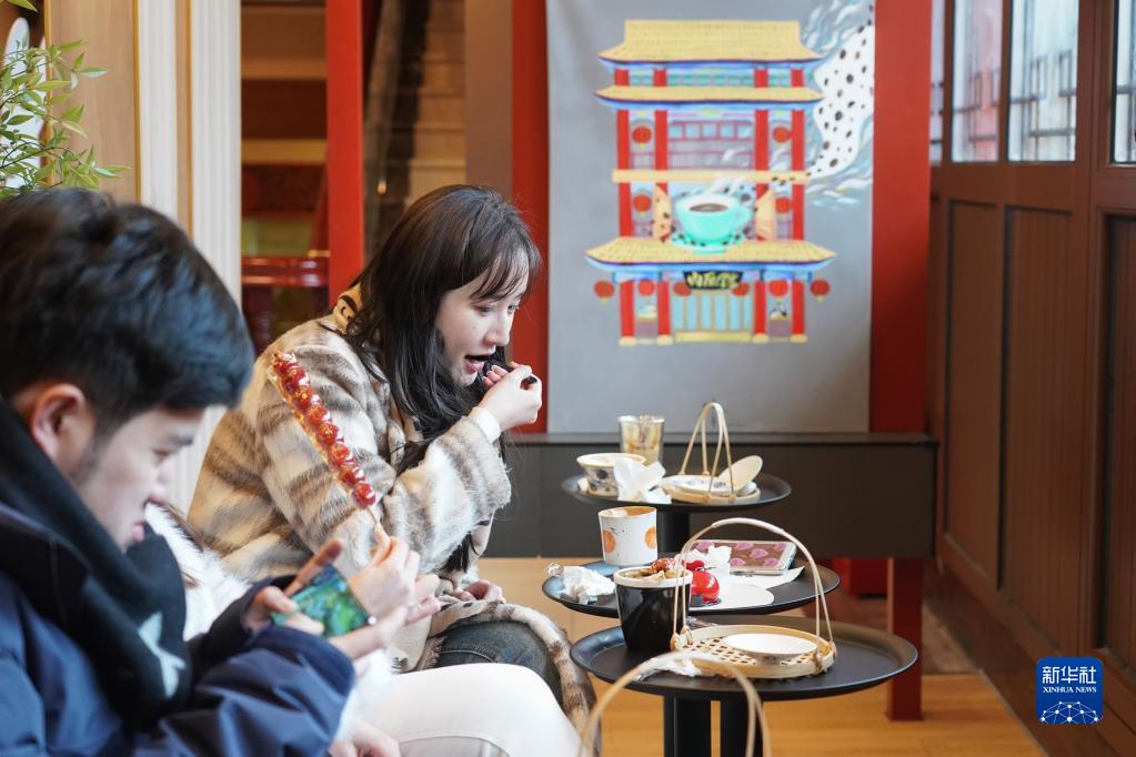 在位于北京大柵欄的內聯升“大內·宮?!笨Х葟d,顧客在品嘗特色茶點(2月18日攝)。