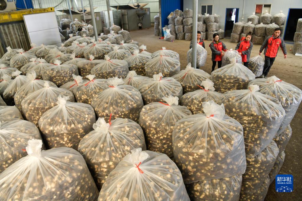 工人在貴州省天柱縣藍田鎮發鑫羊肚菌產業園搬運已烘干的羊肚菌(2月27日攝)。