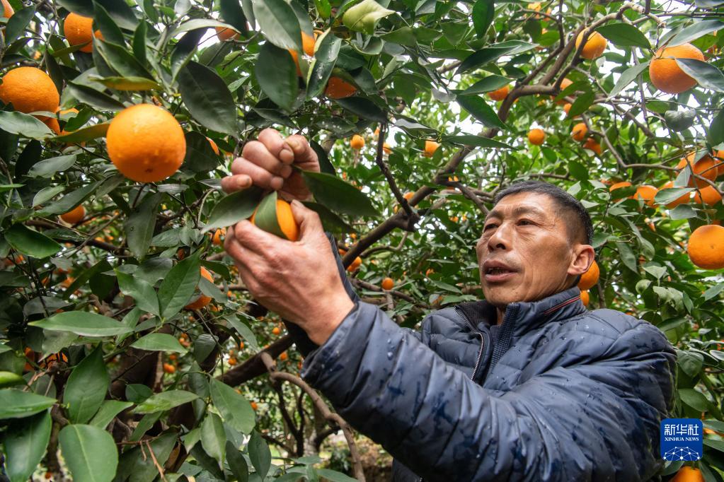 2月28日,在重慶市奉節縣永樂鎮大壩村的臍橙種植園內,農戶在采摘臍橙。