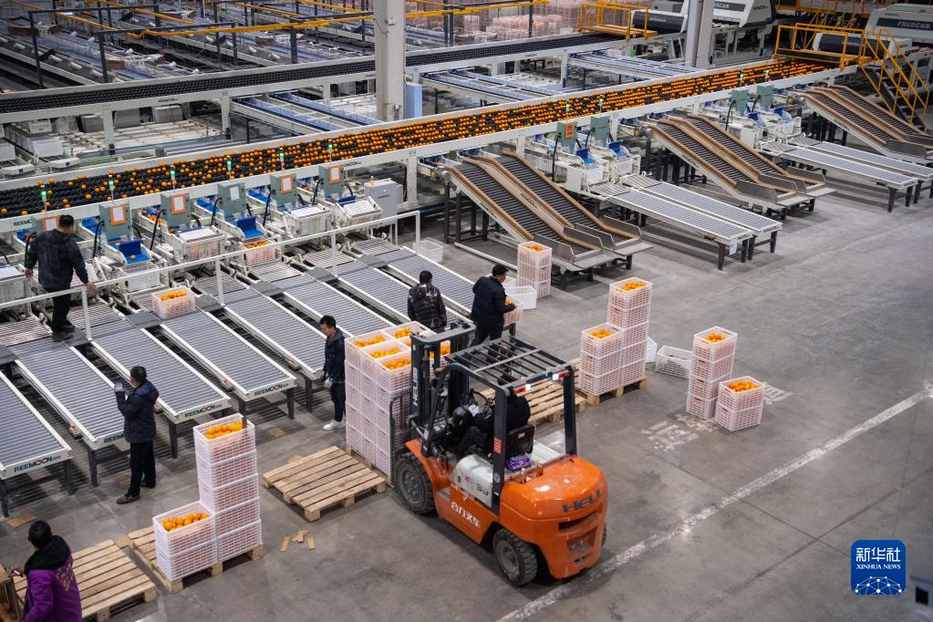 2月28日,在位于重慶市奉節縣的中國三峽柑橘(奉節臍橙)交易中心,工作人員在生產線上分選臍橙(無人機照片)。該中心日處理果品最大產能達800噸,是西南片區最大的臍橙交易中心。