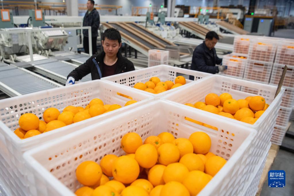 2月28日,在位于重慶市奉節縣的中國三峽柑橘(奉節臍橙)交易中心,工作人員在生產線上分選臍橙。該中心日處理果品最大產能達800噸,是西南片區最大的臍橙交易中心。