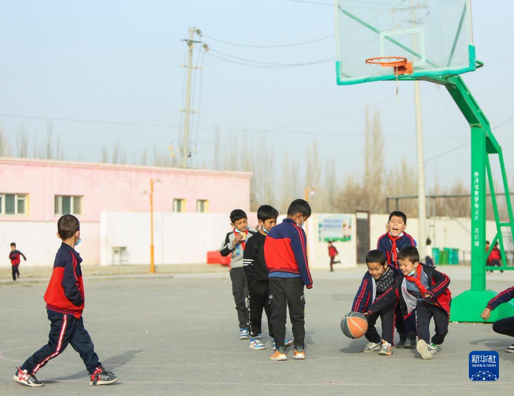 3月1日,和田縣塔瓦庫勒鄉巴克墩村小學學生在課間休息時打籃球。