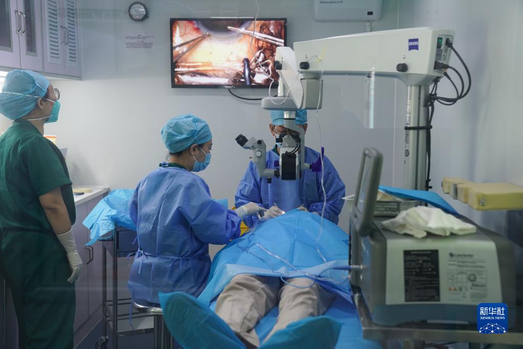 2月26日,在吉布提首都吉布提市貝爾蒂醫院的流動手術車內,醫療隊員為白內障患者進行白內障手術。