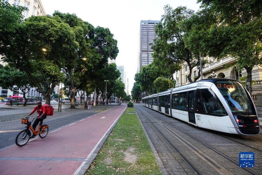 3月1日,一輛輕軌列車駛過巴西里約熱內盧市中心街道。