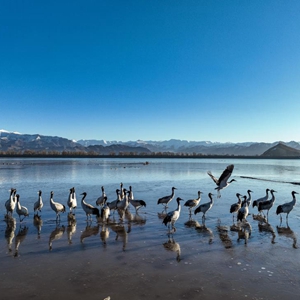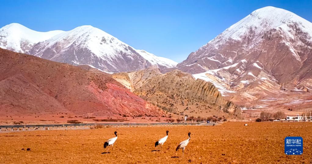近日,西藏拉薩市各區縣迎來降雪。群山被白雪覆蓋,高原壯麗唯美。黑頸鶴、斑頭雁等翩躚起舞,拉薩河谷生機盎然。
