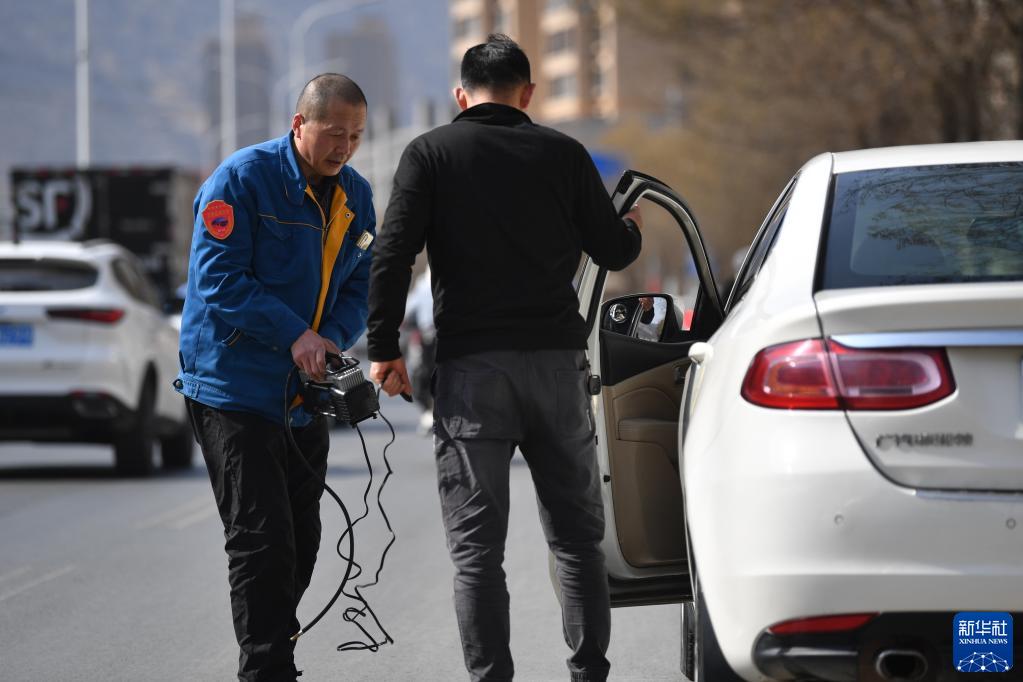 強漢紅在路上幫助一名車主檢查解決車輛輪胎故障(3月1日攝)。