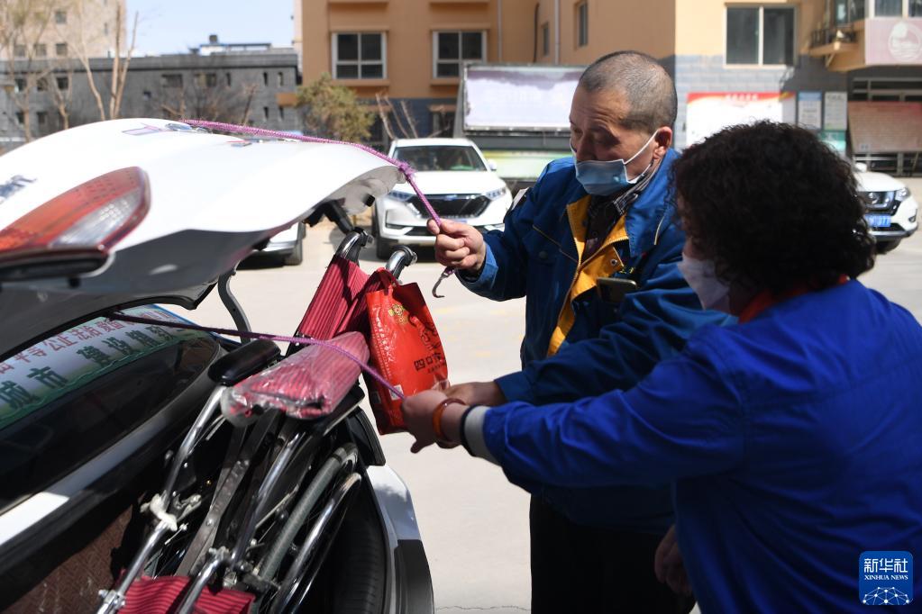 強漢紅(左)和同事胡建萍將老人的輪椅放入后備箱并固定好準備出發(3月1日攝)。
