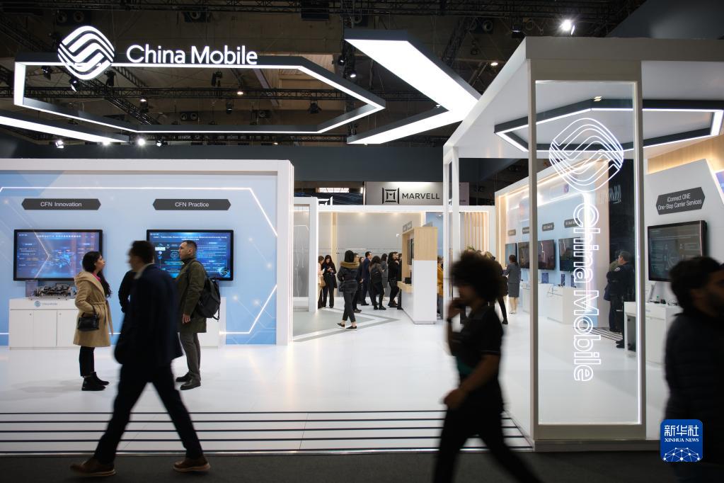 這是3月1日在西班牙巴塞羅那拍攝的世界移動通信大會上的中國移動展臺。