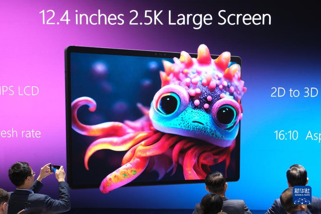2月28日,在西班牙巴塞羅那,人們在世界移動通信大會上觀看中興裸眼3D平板電腦發布會。