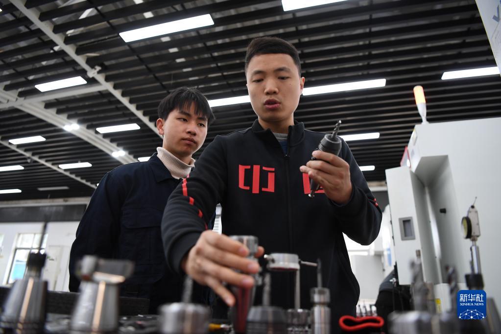 在廣東省機械技師學院模具工程項目集訓基地,楊登輝(右)為實習學生講解不同刀頭的作用(2月14日攝)。