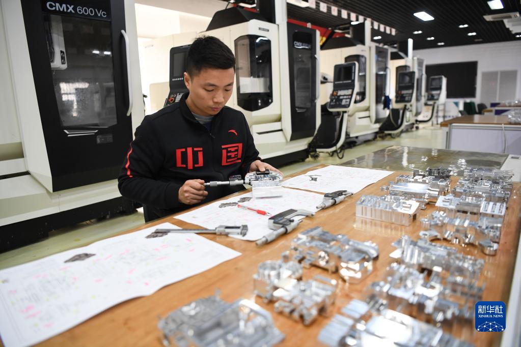 在廣東省機械技師學院數控銑集訓基地,楊登輝對學生加工的零部件進行測量(2月14日攝)。
