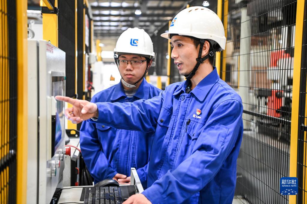 2月14日,在廣西柳工機械股份有限公司的生產車間內,周穎峰(右)給徒弟講解數控設備操作細節。