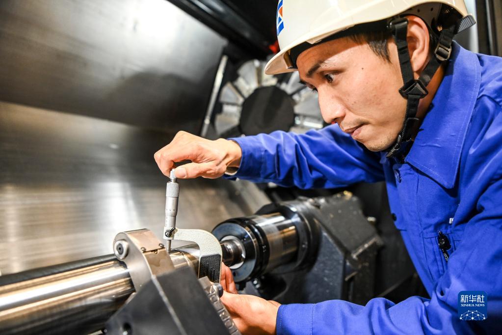 2月14日,在廣西柳工機械股份有限公司的生產車間內,周穎峰對加工中的液壓配件進行測量。