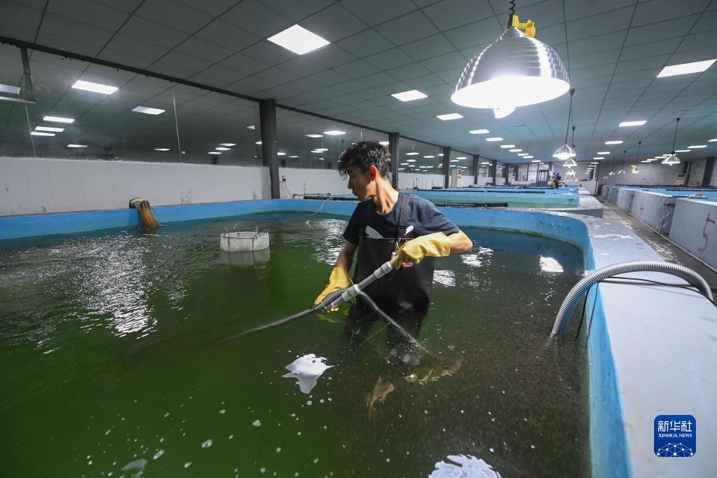 3月2日,在位于湖州市吳興區東林鎮保健村的湖旺水產基地的恒溫繁育車間內,工作人員在進行人工吸污并查看水池中鱸魚魚苗的生長情況。該水產基地460畝育苗池塘配套著恒溫設備,數字化繁育車間每日能孵化出2000萬尾魚苗,供給周邊的漁業養殖戶。