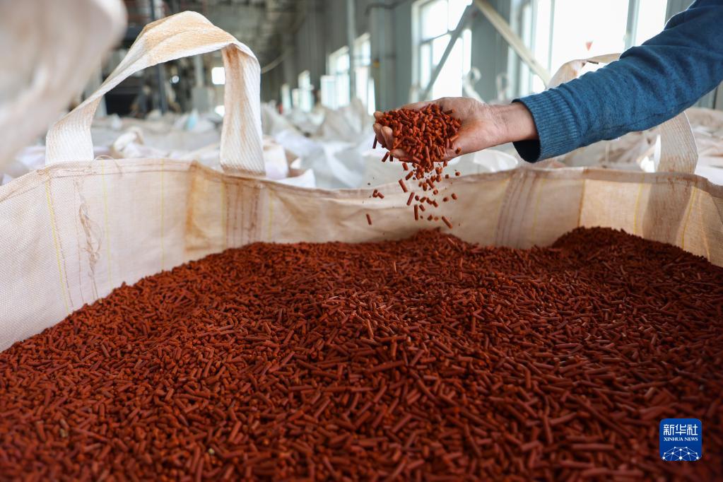 3月1日在和田縣塔瓦庫勒鄉辣椒產業園拍攝的辣椒初加工形成的顆粒。