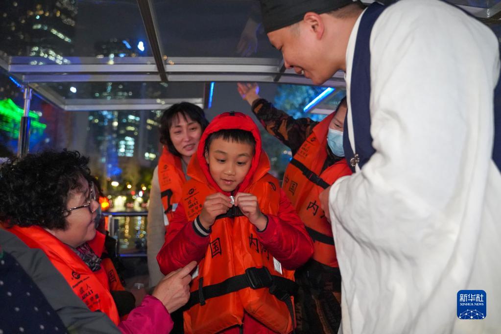 在四川省成都市“夜游錦江”游覽河段,工作人員在游船上與乘客互動(3月1日攝)。