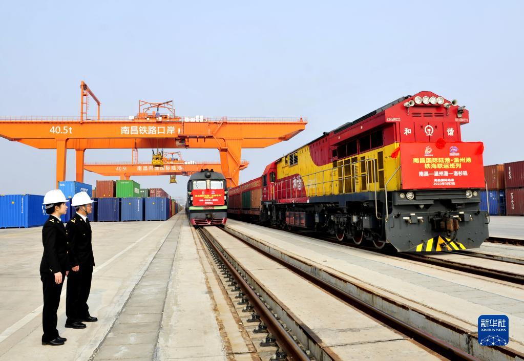 3月2日,“南昌-溫州港-洛杉磯”鐵海聯運班列(前)準備從南昌國際陸港鐵路口岸二期駛出。