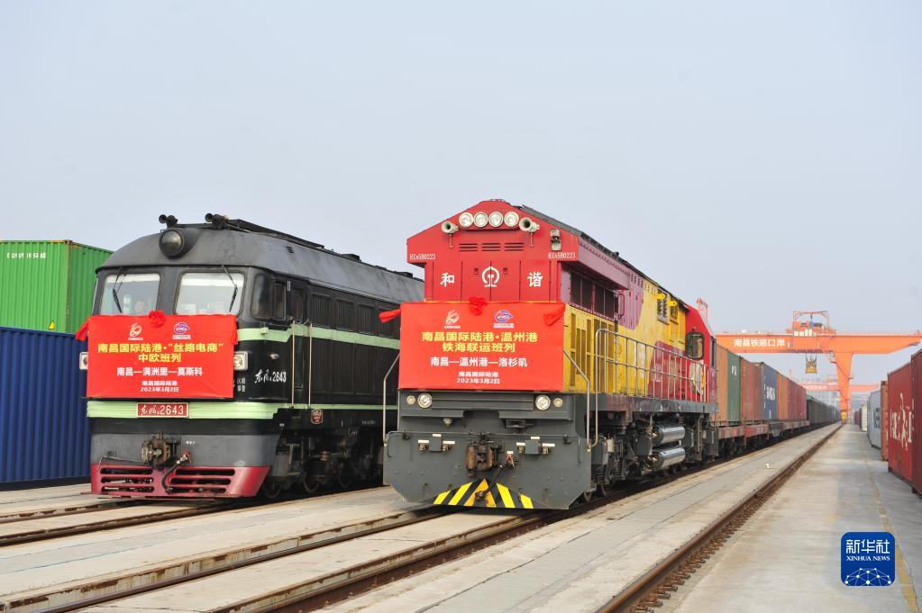 3月2日,“南昌-滿洲里-莫斯科”中歐班列(左)、“南昌-溫州港-洛杉磯”鐵海聯運班列準備從南昌國際陸港鐵路口岸二期駛出。