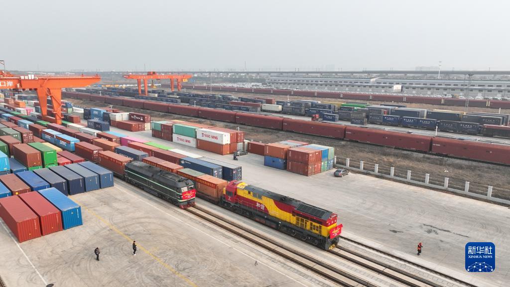 3月2日,班列準備從南昌國際陸港鐵路口岸二期駛出(無人機照片)。