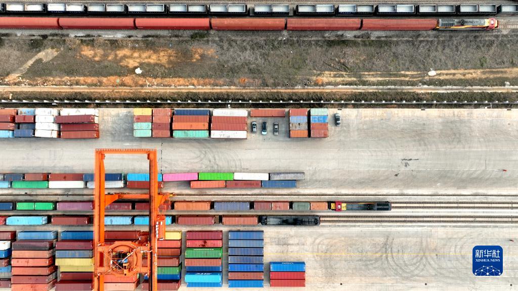 3月2日,班列準備從南昌國際陸港鐵路口岸二期駛出(無人機照片)。