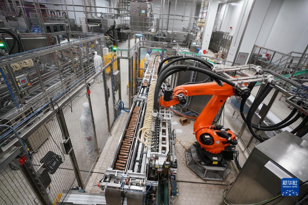 在夢龍冰淇淋柔性生產線上,機器人對產品進行裝箱作業(3月1日攝)。