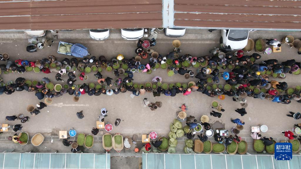 3月2日,在雅安市名山區雙河鮮葉交易市場內,茶農與茶企在進行茶葉交易(無人機照片)。