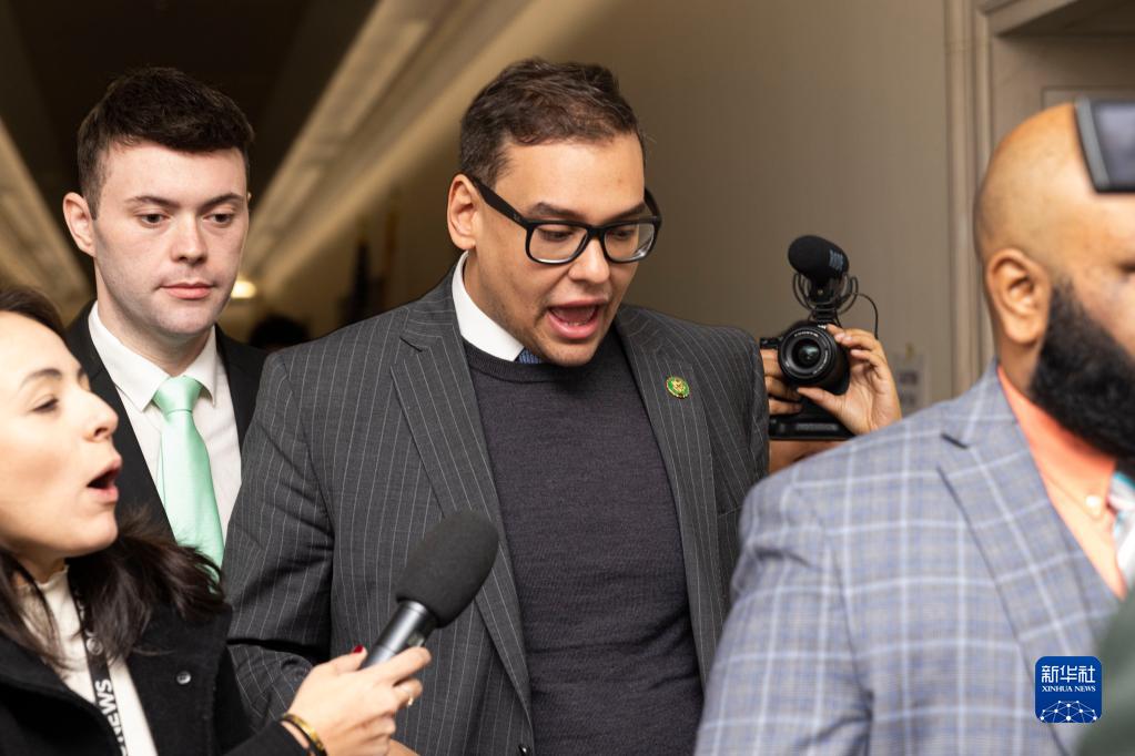 這是1月25日在美國華盛頓國會拍攝的美國紐約州聯邦眾議員喬治·桑托斯(中)。