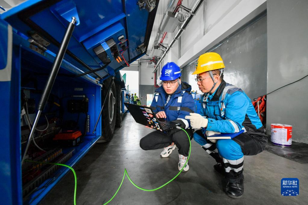 在天津港全物聯網集裝箱碼頭維修間,成衛東(右)與技術工程師對智能水平運輸機器人進行程序編輯(2月17日攝)。