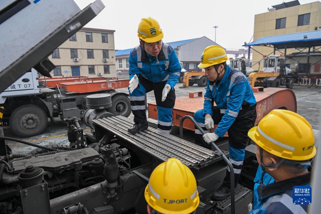 在天津港第一港埠有限公司,成衛東在一輛正在維修的拖頭上實地教學(2月17日攝)。