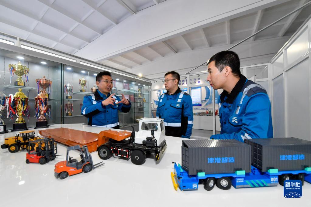 在天津港成衛東勞模創新工作室,成衛東(左)向徒弟們講述產業工人技術創新方向(2月17日攝)。