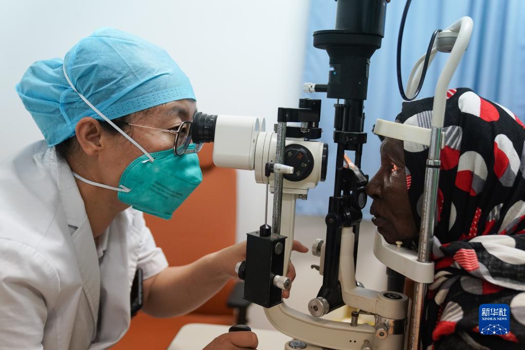 3月1日,在吉布提首都吉布提市貝爾蒂耶醫院,中國第21批援吉布提醫療隊醫生周瑞芳為當地患者進行眼部檢查。